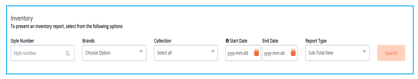 - To view the inventory status for a specific item, enter the Style Number and Brand name, then click on "Search." This action will generate an inventory report highlighting the current status of the specified style number.