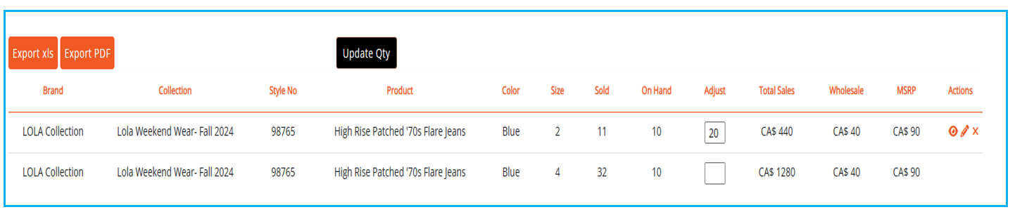 Note: Modify the availability of inventory for specific styles and sizes effortlessly through the "Adjust" function. Simply input the desired value, triggering a pop-up box labeled "Update Qty." Click on it, and witness the seamless update of the On Hand inventory count.